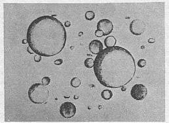 Coacervate droplets in a system of gum arabic and gelatine. After: Oparin (1968), Dose and Rauchfuß (1975). The coacervate droplets, Prof. A. I. Oparin was able to make in his chemical experiments at the Bakh Institute for Biochemistry in Moscow. They are supposed to prove chemical evolution and the basic laws of dialectic materialism. But these coacervates, he has made from modern materials, and not from compounds, one would expect to find in the dead primordial chemical soup.