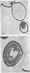 Top: Electron-microscopic picture of a cut through a proteinoid-microsphere. From Fox and Dose (1972), Dose and Rauchfuß (1975). Bottom: Electron-microscopic picture of a cut through a proteinoid-microsphere. From Fox and Fukushima (1964), Dose and Rauchfuß (1975). They have nothing to do whatsoever with a living cell, nor with any pre-stages of a living cell.